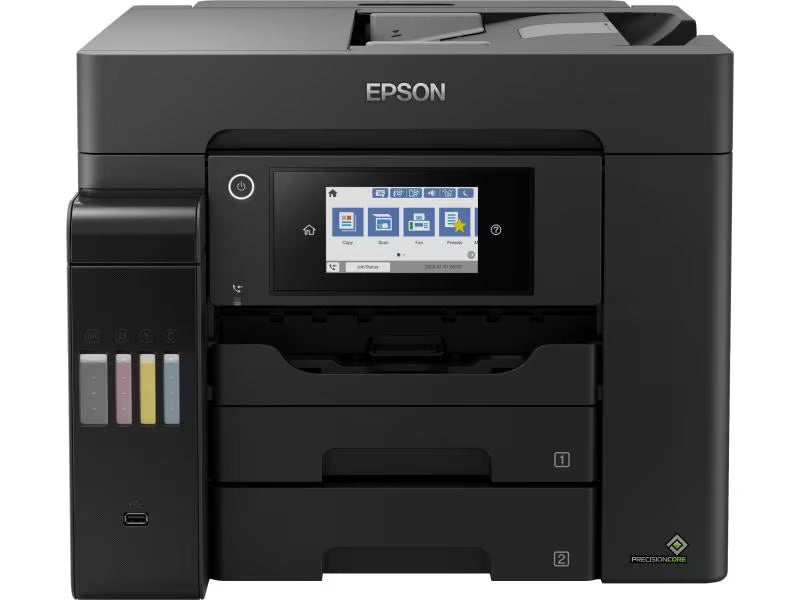 The Epson EcoTank ET-5850 is the perfect choice for demanding home office users and small workgroups who insist on the high print quality of an inkjet printer, but at the same time want to keep the follow-up costs low. The "Ecotank" system with large-volume refill ink tanks directly on the device makes this possible. In addition to printing, you can also scan, copy and fax with this device. To scan, you use the flatbed scanner or the fast duplex ADF scanner, depending on the source material. You don't have to worry about consumables for a long time: The scope of delivery includes starter ink for up to 4500 pages in black and white and up to 2800 pages in color.