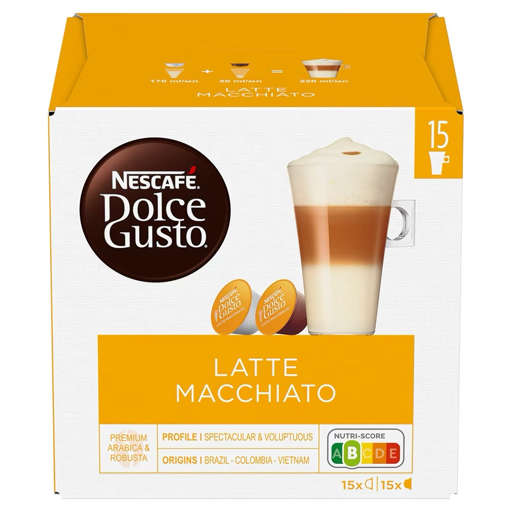 Enjoy the creamy coffee taste of Nescafé Latte Macchiato with the 30 capsules for Nescafé Dolce Gusto. The capsules consist of a mixture of mild coffee and sweet milk, which is processed into a unique latte macchiato. Enjoy your creamy milk coffee and create all your favorite drinks according to your taste.