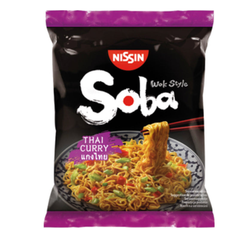 The product “Nissin Soba Thai Curry 110 g” is a pack of instant soba noodles from the Nissin brand. The pack contains 110g and offers the taste of Thai curry. Soba noodles are a type of Japanese noodle often made from buckwheat. This ready meal contains both the noodles and the seasoning mixture. It is prepared by adding hot water and possibly the seasoning mixture to taste. This product is characterized by its quick preparation and is suitable for a tasty meal, whether at home or on the go.