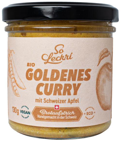 Dies ist unsere milde Version des Curry-Brotaufstrichs. Dank seiner ausgewogenen Sanftheit ist er bei Kindern sehr beliebt. Als Basis für diesen Aufstrich dienen weiße Bohnen und Kichererbsen. Gewürze wie Kurkuma, Curry und geriebener Ingwer sowie frische Petersilie verleihen dem Aufstrich einen einzigartigen Geschmack. Eine zusätzliche Überraschung ist der von Hand geschnittene Schweizer Apfel.