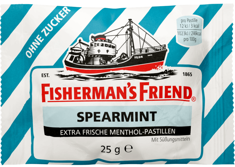 Fisherman's Friend Spearmint sind 25 g erfrischende Lutschpastillen mit Minzgeschmack. Sie bieten sofortige Linderung bei Halsschmerzen und haben einen angenehm erfrischenden Geschmack. Ideal für einen frischen Atem unterwegs.