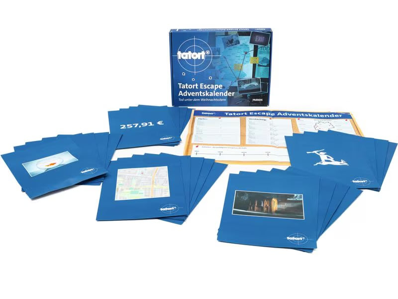 Tatort-Experte Mani Beckmann hat einen Krimi zum Miträtseln entwickelt, der eine echte Herausforderung für die grauen Zellen ist. Die Kombination aus packendem Adventskrimi und spannendem Escape-Spiel ist der ideale Spielspass für 1-4 Spieler:innen ab 16 Jahren. In jedem der 24 Umschläge finden die Mitspieler:innen Ermittlungsunterlagen in Form von Tatortfotos, Zeitungsausschnitten, Postkarten oder Briefen. Als zusätzliches Feature gibt es eine Online-VoicE-Mail und für einige Rätsel kann eine Internetrecherche notwendig sein. In «Echtzeit» ermittelt man täglich mit den Tatort-Kommissarinnen und -Kommissaren, folgt den Hinweisen des Täters oder der Täterin und löst so am 24. Dezember den Fall – wenn man keine Ermittlungsfehler gemacht hat.