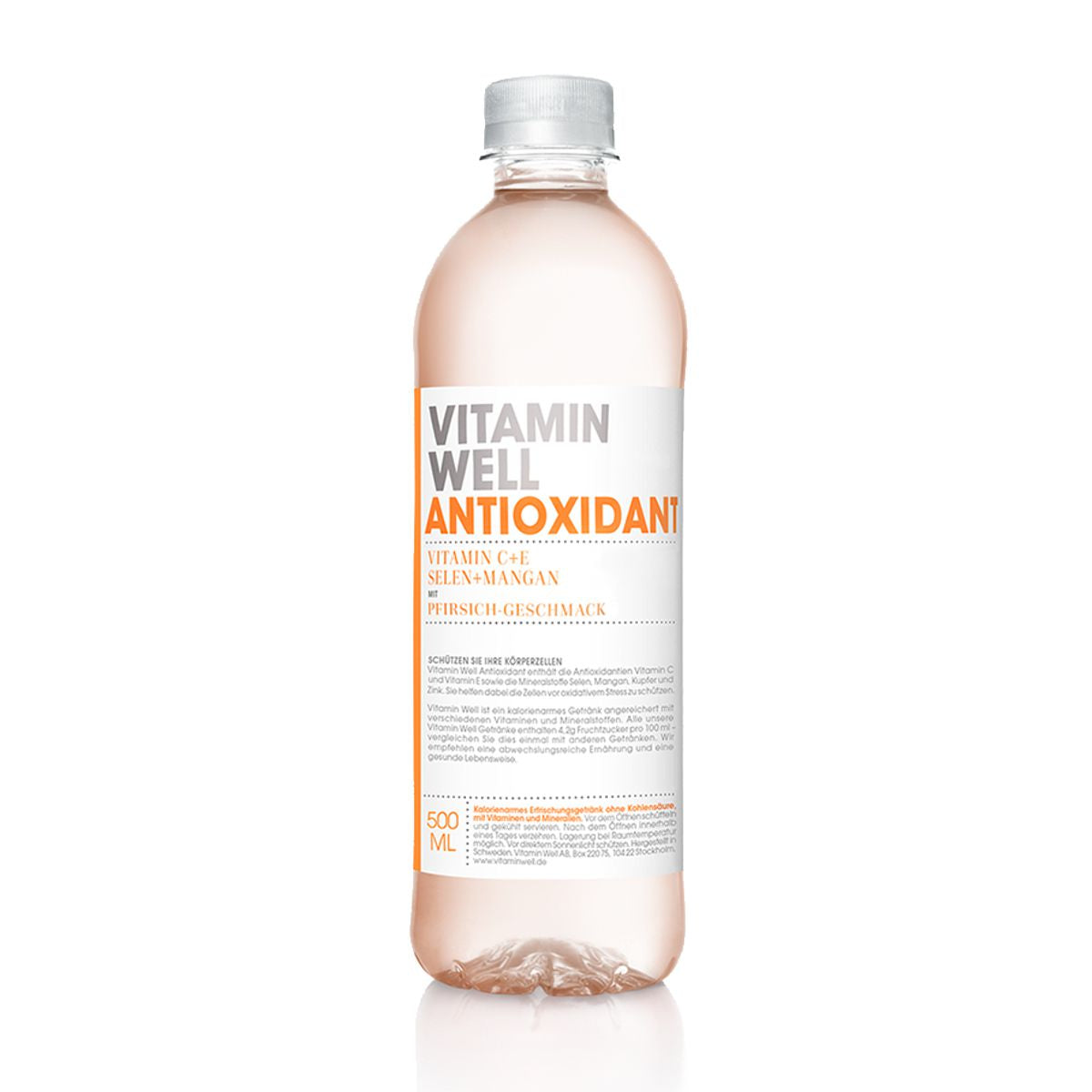 Nicht karbonisiertes Erfrischungsgetränk mit Vitaminen und Mineralien. Vitamin Well Antioxidant mit Pfirsich-Geschmack.